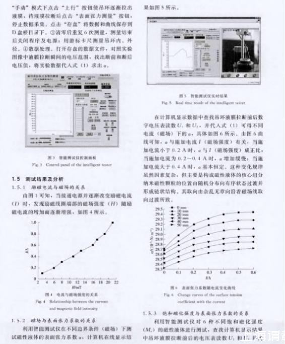 摘要:利用同種磁性液體表面張力智能測試儀在不同邊界條件下對磁性液體的表面張力系數(shù)進行了測試,實驗結(jié)果表明,磁性液體表面張力系數(shù)與磁場強度及其飽和磁化強度成正比。利用不同儀器、在相同邊界條件下對同種磁性液體表面張力系數(shù)測試的結(jié)果表明,智能儀器能夠準確獲取磁性液體液膜斷前、斷后的電壓值,減小依靠人眼盲讀電壓值產(chǎn)生的誤差,測試精度比傳統(tǒng)儀器提高了4.14。