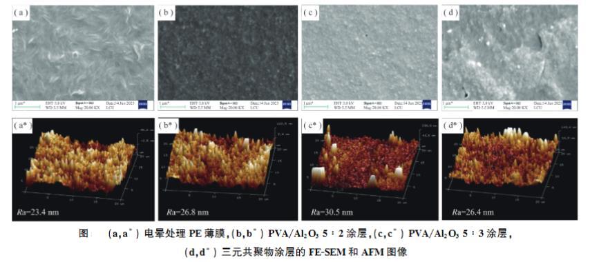 涂覆PVA/Al?O?后,表面變得更為粗糙,Al?O?納米顆粒均勻分散在PVA基質中,形成了微納復合結構。AFM測得的粗糙度(Ra)順序為:PVA/Al?O?5:3>5:2>AHB三元共聚物>電暈PE。