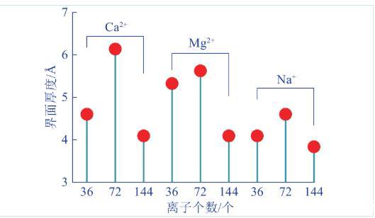 溶劑密度從10%升到90%的范圍為界面層,通過相對數密度分布曲線可估算出界面厚度。不同濃度含鹽泡沫體系界面厚度變化的火柴圖,如圖4所示。由圖4可知,不同濃度含鹽泡沫體系界面厚度隨濃度的變化規律一致。即當離子種類一定時,高濃度含鹽泡沫體系的界面厚度最小,低濃度次之,中濃度最大。對于低濃度含鹽泡沫體系而言,Mg2+的界面厚度最大,Ca2+次之,Na+最小;中濃度含鹽泡沫體系中,Ca2+的界面厚度最大,Mg2+次之,Na+最??;高濃度含鹽泡沫體系中,Mg2+的界面厚度最大,Ca2+次之,Na+最小。綜上可知,硬水離子的存在使得泡沫界面厚度有所增加,這意味著界面中水分子內部的相互作用減弱,使得界面水分子受到的指向泡沫內部的不平衡拉力減弱。
