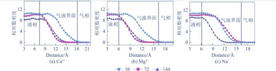 由圖3,水分子相對數密度從液相到氣相逐漸減少到0,在液相區域內,離子濃度越高水分子的相對數密度越低。其中Ca2+與Mg2+泡沫體系的變化規律大體一致,而Na+泡沫體系則有所差異。對于Ca2+、Mg2+泡沫體系而言,低濃度時水分子的相對數密度在除氣相區域外的任何區域內均大于中、高濃度時的相對數密度,中、高濃度曲線在氣液界面區域內交于1點后,中濃度時水分子的相對數密度開始小于高濃度時水分子的相對數密度。但中、高濃度曲線的交匯處明顯不同,Ca2+泡沫體系在9.2?附近產生交匯,Mg2+泡沫體系在7.2?附近產生交匯,兩者交匯時水分子的相對數密度均為8.1。Na+泡沫體系中,高濃度時水分子的相對數密度在除氣相區域外的任何區域內均小于中、低濃度時的相對數密度,中、高濃度曲線在氣液界面區域內交于1點后,中濃度時水分子的相對數密度開始大于高濃度中水分子的相對數密度。