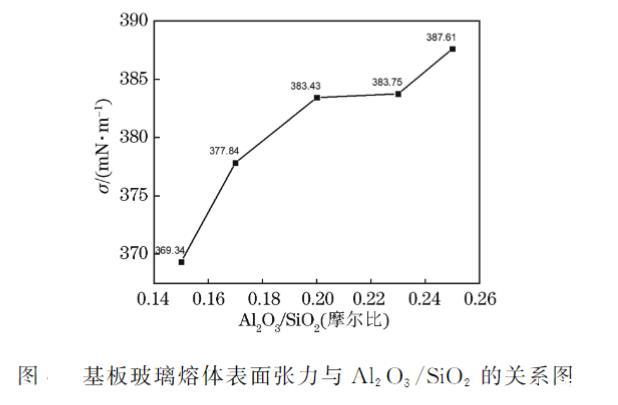 圖 3 基板玻璃熔體表面張力與 Al?O?/SiO? 的關(guān)系圖