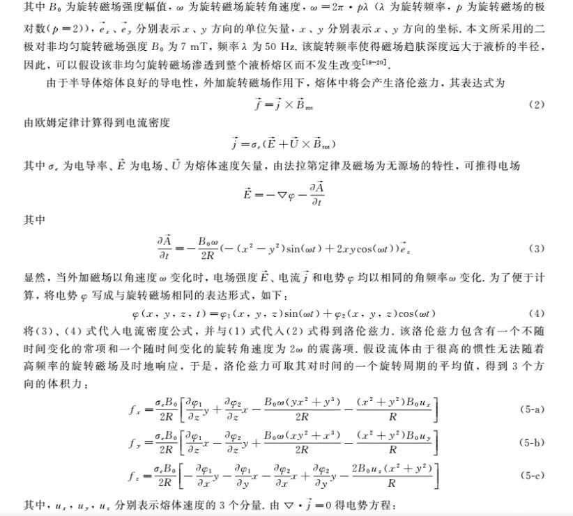 其中B_0為旋轉磁場強度幅值,ω為旋轉磁場旋轉角速度, ω=2πf (f為旋轉頻率), p為旋轉磁場的極對數(p=2), e_z、e_θ分別表示z、θ方向的單位矢量。本文所采用的二極對非均勻旋轉磁場強度B_0為7 mT,頻率為50 Hz。該旋轉頻率使得磁場趨膚深度遠大于液橋的半徑,因此,可以假設該非均勻旋轉磁場滲透到整個液橋熔區(qū)而不發(fā)生改變。
