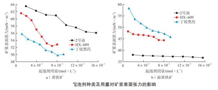 結果發(fā)現(xiàn):隨著起泡劑用量的增加,黃鐵礦與磁黃鐵礦的表面張力均整體呈下降趨勢。對于黃鐵礦礦漿表面張力的影響,2號油>HX-609>丁銨黑藥,HX-609的表面張力雖然不是最低,但 HX-609達到最低礦漿表面張力所用藥劑用量最少,可以明顯降低藥劑使用成本。對于磁黃鐵礦礦漿表面張力的影響,丁銨黑藥>HX-609>2號油,且三者差值較大,2號油用量為3×10?? mol/L時可顯著降低礦漿表面張力。