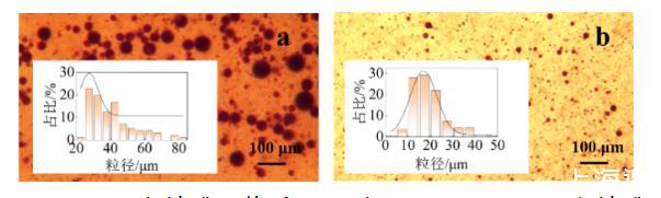 圖6 C16A溶液(a)和C16A-SiO2乳化劑(b)形成的乳液光學圖像和粒徑分布