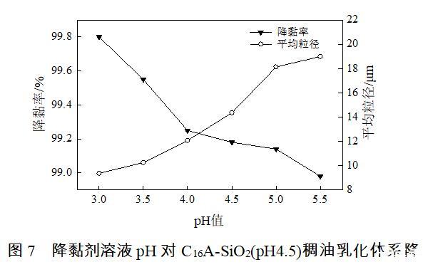 實驗發現,pH≥6的水油混合液均質很難發生乳化作用,C16A-SiO2(pH4.5)降黏劑溶液與稠油發生乳化作用的溶液pH≤5.5。當溶液pH≤5.5時,降黏率達98.0%以上。隨著降黏劑溶液pH的降低,稠油降黏率逐漸提升,C16A-SiO2(pH4.5)稠油乳化體系平均粒徑減小,分布逐漸集中在5~20 μm之間。