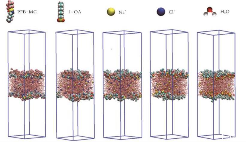 MD模擬在原子尺度解析短鏈氟碳復(fù)配體系(如陰/陽離子型、氟碳/碳?xì)浠旌闲停┑亩嘟M分協(xié)同機(jī)制方面具有獨(dú)特優(yōu)勢(shì),能定量揭示界面分子排布、相互作用及微觀?宏觀關(guān)聯(lián)。圖8為不同n(PFB?MC)/n(1?OA)復(fù)配體系的最終MD模擬模型。