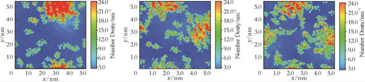 對(duì)界面微觀結(jié)構(gòu)與形貌的可視化分析(包括軌跡快照、二維密度俯視圖)可提供分子構(gòu)象、排列及聚集狀態(tài)的直觀圖像,輔以界面漲落分析及團(tuán)簇分析,可有效探測(cè)界面在橫向(x?y平面)的均質(zhì)性、微相分離現(xiàn)象(如氟碳/氫碳富集區(qū))、微小聚集體(如半膠束)的形成以及界面粗糙度。圖6為x?y平面內(nèi)表面活性劑分子的二維數(shù)密度分布圖。