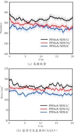 圖7 不同復(fù)配體系中表面活性劑分子的關(guān)鍵動(dòng)態(tài)性質(zhì)隨時(shí)間的演變曲線