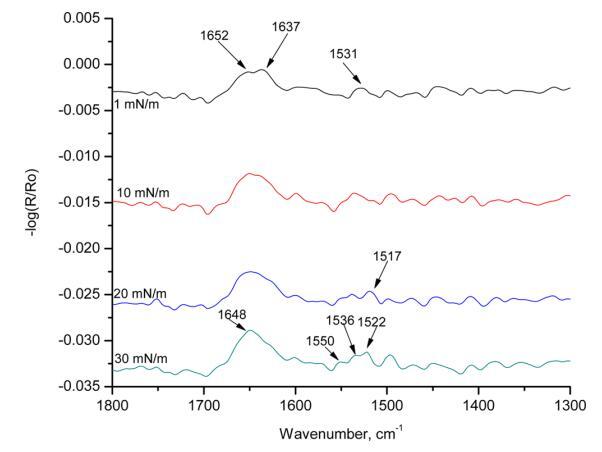 圖7顯示了HI-Langmuir單層在不同表面壓力下60°時的p極化。 這條帶子在1517厘米處 ? 1對應(yīng)于α-螺旋。 在1 mN/m的表面壓力下,有兩個可見帶:1652和1637 cm ? 1. 隨著表面壓力的增加,這兩個譜帶重疊并成為一個寬帶。 在30百萬米 ? 1,波段可視為單個波段,頻率為1648厘米 ? 1. 這是對應(yīng)于α-螺旋的酰胺II區(qū)域的條帶。 下一個波段在1531厘米處以1 mN/m的寬帶出現(xiàn) ? 1. 隨著表面壓力的增加,它分成三個帶:1550、1536和1522厘米 ? 1. 在1550和1522厘米處的頻帶 ? 1分別對應(yīng)于α-螺旋和β-折疊中的酰胺II區(qū)域。 這種譜帶分裂表明,譜帶位于1531厘米處 ? 在較低的表面壓力下,1由α-螺旋和β-片組成。 在較高的表面壓力下,譜帶分離為離散的單個峰。 光譜中出現(xiàn)的其他峰是由于氨基酸和烷烴鏈的存在。 這條帶子長1448厘米 ? 1對應(yīng)于C ? H CH2和CH3的剪切。 HI-Langmuir單分子膜的p-極化輻照度中存在所有三個表明α-螺旋的主譜帶。