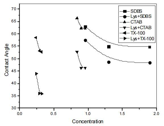 圖2。在溶菌酶存在和不存在的情況下,不同種類表面活性劑的濃度與接觸角曲線圖