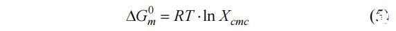 利用不同的熱力學方程計算了空氣/水界面以及膠束中的幾個熱力學參數。這些熱力學參數恰當地代表了系統(tǒng)的可行性。膠束化的標準吉伯自由能0 D Gm可由式(5)計算: