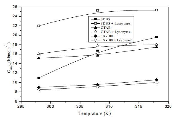 圖1。不同表面活性劑在溶菌酶存在和不存在時Gmin隨溫度的變化