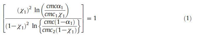 應用正規溶液理論,可以計算混合膠束中表面活性劑分子之間的相互作用參數(β)值,從而提供表面活性劑分子之間相互作用強度的信息。借助正規溶液理論(RST),膠束摩爾分數也可以使用魯賓方程計算: