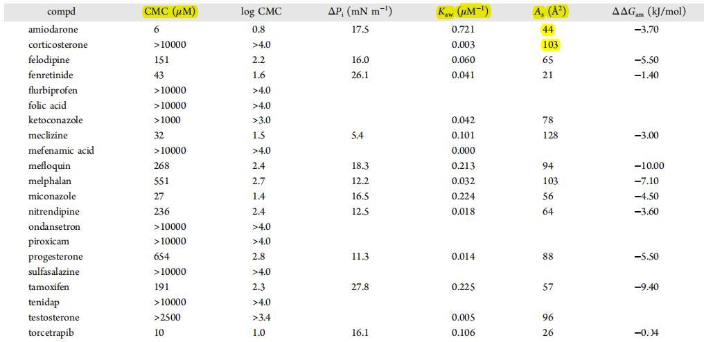 表面活性測定。化合物在DMSO中連續稀釋超過12種不同濃度,并在pH值為6.5的0.05 M磷酸鹽緩沖液中添加至最終10%的DMSO含量。最終化合物濃度默認范圍為10 nM至10 mM。在第二次實驗中,對于達到溶解度極限或需要對相關濃度范圍進行解析以確定最佳參數的情況,定義了替代濃度范圍。樣品靜置10分鐘,以便在液體中平衡?空中接口。表面壓力分布在張力計(MultiPi WS1,Kibron Inc.,芬蘭赫爾辛基)上進行,通過之前的測量(72.8 mN/m)對50μL等份樣品進行校準。通過對生成的等溫線進行曲線擬合確定表面活性參數,并根據經典的空氣吉布斯熱力學理論進行計算?水里,臉上。主要導出參數如下。(i)考:空氣?水分配系數,來自等式2