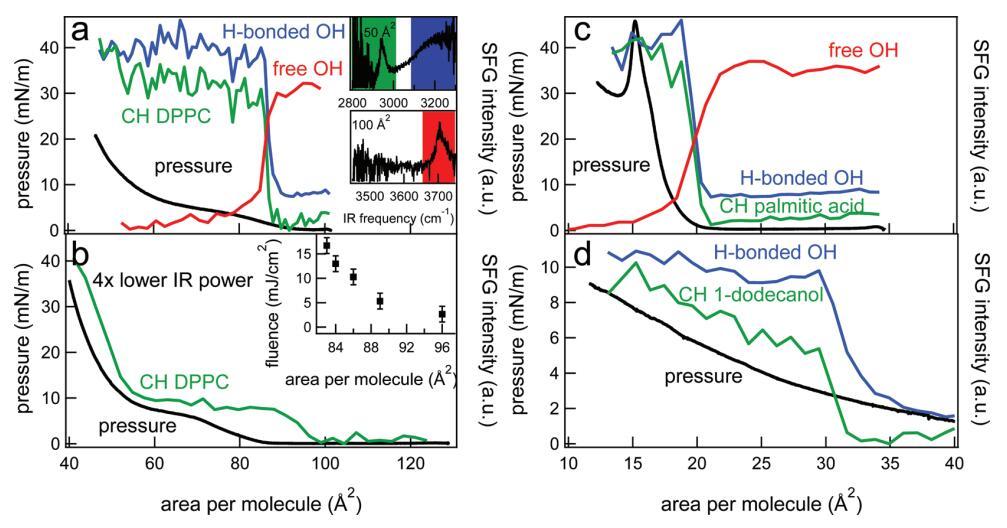 圖2。(a)DPPC的CH信號(綠色)、氫鍵OH信號(藍色)和自由OH信號(紅色)的表面壓力(黑色,左軸)和積分SFG強度(右軸),作為連續壓縮單層過程中每個分子面積的函數。為了清晰起見,集成SFG信號被歸一化,并且彼此之間具有小偏移。集成光譜區域由插圖中的彩色正方形標記,分別顯示CH/OH鍵合和游離OH區域中每個分子50和100?2的SFG光譜。相對較高的紅外通量(~已使用10 mJ/cm2)。(b)與(a)類似,但紅外功率降低了四倍,導致通量降低了四倍(~2.5 mJ/cm2)。插圖顯示了改變紅外注量對SFG信號出現的每個分子面積的影響。(c)類似于(a),但適用于棕櫚酸。(d)類似于(a),但對于1-十二醇。在這種情況下,未測量1-十二醇的游離OH。SFG結果是在SSP極化下獲得的。