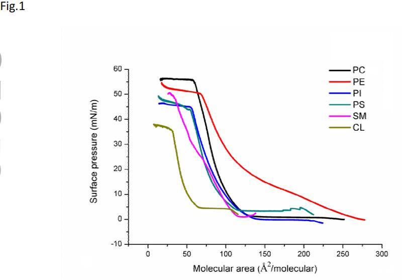 圖1顯示了空氣-水界面上不同磷脂單層的π-A曲線形狀。這里測試的所有磷脂的π-A曲線的形狀都是在所有顯示的表面壓力下單一液體膨脹(LE)和液體冷凝(LC)狀態(tài)的特征。在壓縮時,單層經(jīng)歷了一個轉(zhuǎn)變,這被視為從LE(低于10 mN/m)到LC狀態(tài)的轉(zhuǎn)變。在高分子區(qū)域,由于分子堆積的增加,表面壓力升高,但不改變單層膜的彈性。最后,單分子膜達(dá)到了一種更為濃縮的狀態(tài),但在π-a等溫線的形狀中沒有明顯的崩塌點。對于這里測試的磷脂,它們都可以形成穩(wěn)定的膜,并表現(xiàn)出良好的壓縮性能,DOPC的表面壓力甚至達(dá)到57 mN/m。