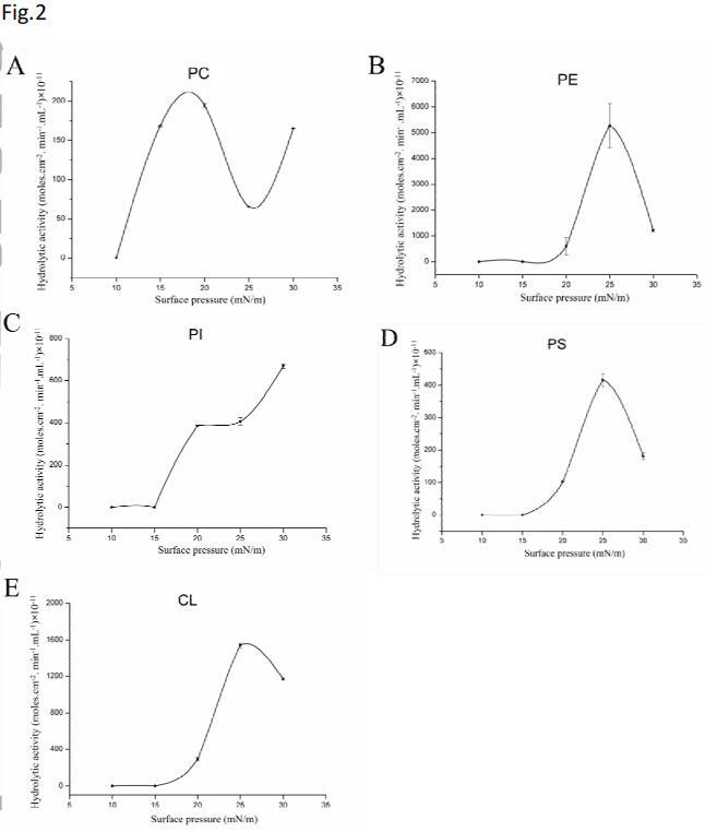 圖2示出了使用各種磷脂作為水解底物獲得的詳細(xì)活性-表面壓力曲線。可以看出,酶的水解活性高度依賴于表面壓力。然而,每種底物的活性曲線不同。發(fā)現(xiàn)基板PE、PS和CL的鐘形曲線具有特征性的最佳表面壓力值(圖2B、D、E)。在低于15 mN/m的表面壓力下,未檢測到基本酶活性。水解活性隨表面壓力的增加而增加。在25 mN/m的表面壓力下,觀察到PE、PS和CL的最大活性。然而,當(dāng)表面壓力高于25 mN/m時,所有這些磷脂的水解活性降低。與所有測試的底物相比,在25 mN/m的表面壓力下,PE的水解率最高,水解活性達(dá)到5272.31×10-11摩爾。cm-2。最小-1。mL-1。對于PI,在15 mN/m以下也沒有觀察到水解速率,但是,沒有觀察到鐘形曲線,并且隨著表面壓力從15 mN/m增加到30 mN/m,活性增強(qiáng)(圖2C)。對于PC,從10 mN/m到25 mN/m觀察到鐘形曲線,但在30 mN/m的表面壓力下,活性進(jìn)一步增加。隨著表面壓力從25 mN/m增加到30 mN/m,表面輪廓上的單層構(gòu)象可能發(fā)生了變化,導(dǎo)致活性增加。在本實驗中,在測試的表面壓力范圍內(nèi),SM沒有活性。從π-A曲線可以看出,在25 mN/m的表面壓力下測試的所有磷脂都處于液態(tài)冷凝狀態(tài),沒有達(dá)到各自的坍塌壓力。在這種情況下,超卵磷脂酶對不同單分子磷脂膜的偏好順序為PE>CL>PS>PI>PC。在這些條件下,SM沒有活性。Lecitase Ultra選擇性的詳細(xì)機(jī)制仍需闡明。