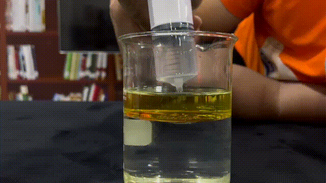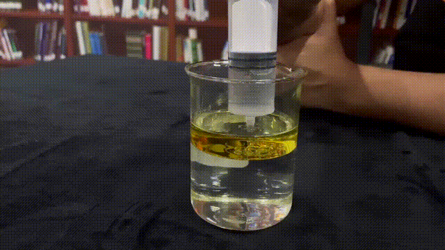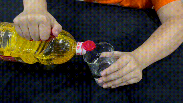 首先,我們沿杯壁向盛有水的燒杯中加入食用油,使水油有一個干凈的界面