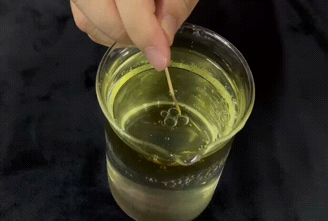 不過如果我們用牙簽去破壞這個界面,小水球就會“合成”大水球,或者如果去破壞水球與下方水面之間的油膜的話,水球就會破裂、流入燒杯底部。