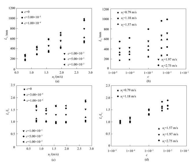 為了定量表征表面張力變化對(duì)射流破裂過程的影響,實(shí)驗(yàn)測量了含表面活性劑射流的射流破裂長度。射流破裂長度定義為噴嘴出口至射流首次發(fā)生破裂處的距離。圖6是含表面活性劑射流破裂長度隨射流速度u l的變化趨勢,其中L s(mm)表示含表面活性劑射流的射流破裂長度,L l(mm)為水的射流破裂長度。從圖6(a)中可以看出,當(dāng)表面活性劑濃度保持不變時(shí),提高液體射流速度會(huì)增大射流破裂長度。從圖6(b)中可以看出,當(dāng)液體射流速度保持不變時(shí),隨著表面活性劑濃度的增大,射流破裂長度總體上呈現(xiàn)逐漸增大的趨勢;射流速度越大,射流破裂長度增大的趨勢就越明顯。使用相同工況下水的射流破裂長度無量綱化含表面活性劑射流的破裂長度后,可以得到射流破裂長度比隨射流速度以及表面活性劑濃度的變化趨勢,如圖6(c)、(d)所示。從圖中可以看出,表面活性劑的加入顯著增大了射流破裂長度比。在表面活性劑濃度不變時(shí),提高液體射流速度對(duì)射流破裂長度比的影響并不顯著。在射流速度保持不變時(shí),提高表面活性劑濃度會(huì)導(dǎo)致射流破裂長度比的增大。