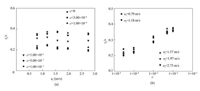 從圖7(a)中可以看出,當(dāng)表面活性劑濃度保持不變時(shí),射流破裂時(shí)間幾乎不隨射流速度的改變而改變。在射流速度保持不變時(shí),隨著表面活性劑濃度的增大,射流破裂時(shí)間呈現(xiàn)逐漸增長的趨勢。在實(shí)驗(yàn)參數(shù)范圍內(nèi),射流破裂時(shí)間均小于0.4 s。考慮重力對(duì)液體射流的加速作用,液體射流實(shí)際破裂時(shí)間要小于0.4 s。