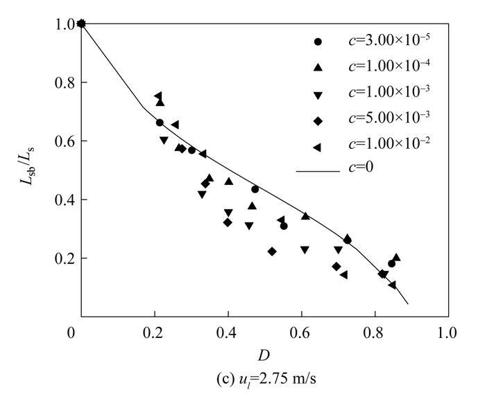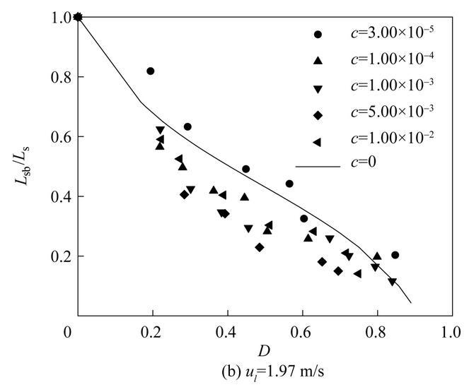圖11是不同濃度表面活性劑射流破裂長度L sb隨氣泡無量綱直徑D=d b/d 0(d b為氣泡直徑)的變化。從圖中可以看出,不同表面活性劑濃度下,射流破裂長度隨氣泡無量綱直徑D的變化趨勢是相似的。射流破裂長度隨著氣泡直徑的增大逐漸減小;當(dāng)氣泡直徑相同時(shí),提高液體射流速度會(huì)導(dǎo)致更大的射流破裂長度。