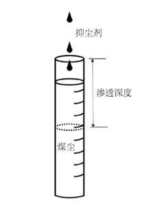 采用正向滲透實驗法研究含有無機鹽的抑塵劑溶液對煤塵浸潤性的影響,如圖1所示。具體步驟為先取1.9克煤粉放入直徑為1 cm、長度為9 cm的無色透明玻璃管中,并用不銹鋼棒將煤塵夯實。配制濃度為0.2 wt.%的抑塵劑溶液,取2毫升該溶液滴入裝好煤塵的玻璃管中,記錄抑塵劑浸潤煤塵高度4 cm時所需要的滲透時間,并且使用下述公式(1)對抑塵劑的潤濕性能進行評價[17]。