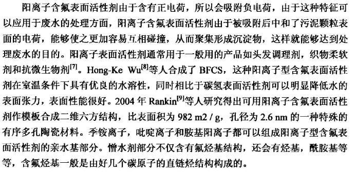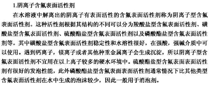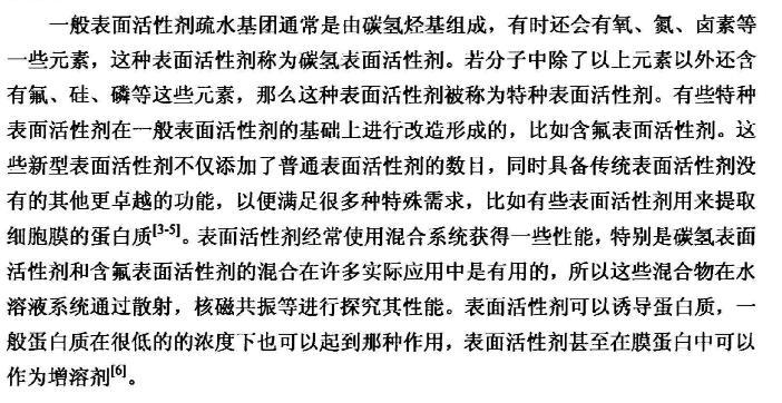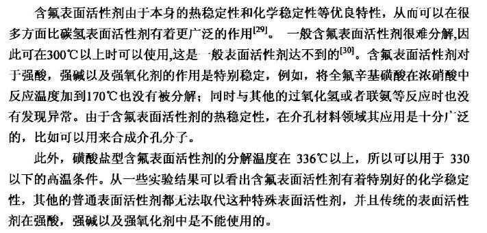 【摘要】:本論文首先對新型含氟表面活性劑的特性,應用領域,國內外研究進展進行了全面的綜述。含氟表面活性劑是目前最受青睞的特種表面活性劑,相比于傳統的碳氫表面活性劑,含氟表面活性劑的用量少,降低水溶液表面張力的作用強,同時可以跟其它表面活性劑起到很好的復配效果,可以應用于消防、鉻霧抑制劑、造紙、冶金、起泡與消泡劑的合成等很多領域。