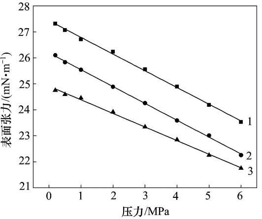 為了研究溫度和壓力對煙道氣?稠油平衡表面張力的影響,分別在80,100和120℃下進行實驗,圖2所示為不同溫度下煙道氣?稠油平衡表面張力隨壓力變化曲線。由圖2可見:當氣體壓力從0.2 MPa升高到6 MPa,在80℃時,煙道氣?稠油表面張力由27.31 mN/m減小到23.53 mN/m,降低了13.84%;在100℃時,煙道氣?稠油表面張力由26.10 mN/m減小到22.26 mN/m,降低了14.71%;在120℃時,煙道氣?稠油表面張力由24.75 mN/m減小到21.75 mN/m,降低了12.12%。當溫度一定時,煙道氣?稠油系統的平衡表面張力隨著壓力的增大而減小,并呈較好的線性關系。這是因為溫度一定時,壓力增大,煙道氣在稠油中的溶解度增大,使得平衡表面張力減小。當壓力一定時,煙道氣?稠油系統的平衡表面張力隨溫度的升高而減小。這是因為煙道氣的主要成分是N2,N2在稠油中的溶解度隨著溫度升高而增大。