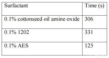 為了比較,還列出了正十二烷基二乙醇胺(1202)和醇醚硫酸鈉(AES)的水分離時(shí)間。 從表 3 可以看出,在表面活性劑濃度為 0.1% 時(shí),蓖麻油酰胺 氧化胺和棉籽油酰胺氧化胺有更長的水分離時(shí)間 比AES,這意味著合成的兩種天然植物油酰胺胺 氧化物具有良好的乳化能力,尤其是蓖麻油酰胺氧化胺。 這 棉籽油酰胺氧化胺的乳化能力與1202相近。 還發(fā)現(xiàn)蓖麻油氧化胺的乳化能力優(yōu)于蓖麻油氧化胺 棉籽油氧化胺,這也歸因于平均烷基鏈長。 [14] 此外,作為乳化劑,它們可以在較寬的pH范圍內(nèi)使用。